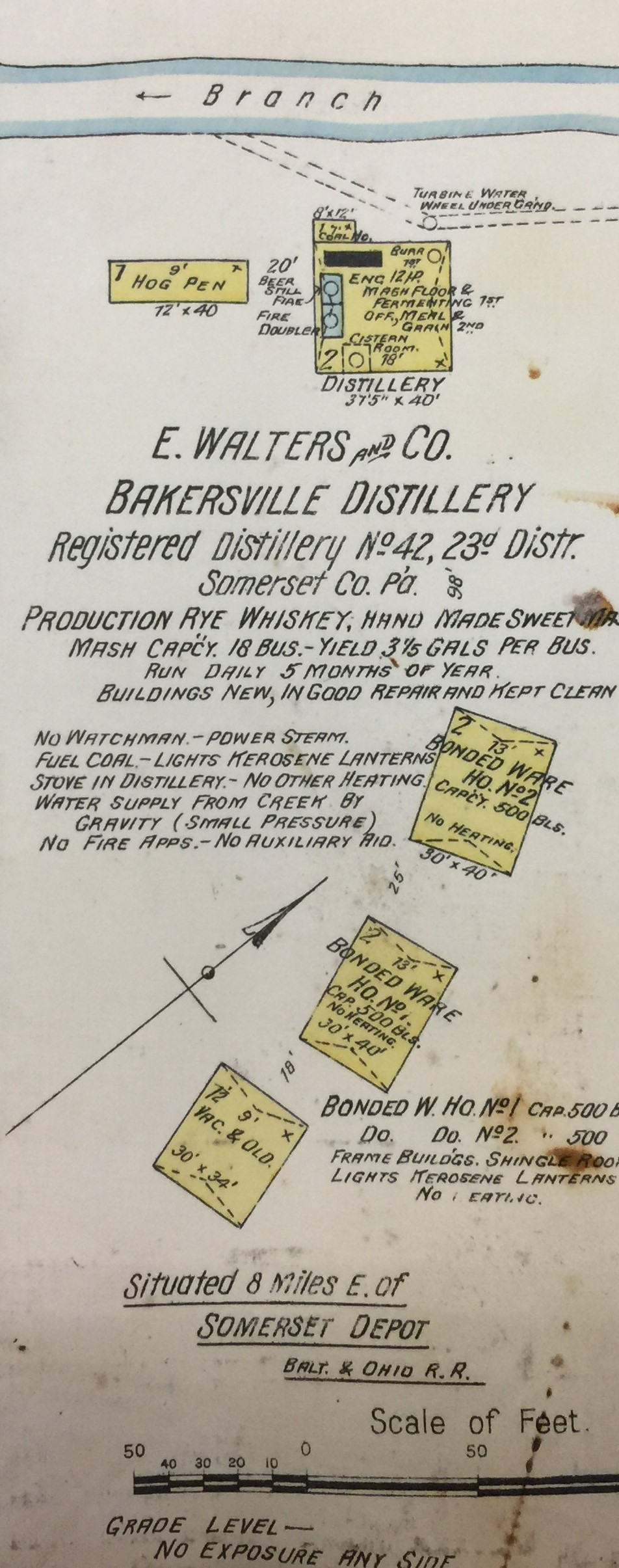 The “Old Baker Rye” brand had been connected to Henry Baker of Somerset County since the early 1800s and had earned its wide reputation for excellence well before the Civil War. Long before Walters purchased the Baker Distillery property, his firm had been using Henry Baker’s famous name to bottle its sourced whiskey. Once he owned the Baker property, he would rebuild the old plant and name his newly refurbished distillery the Bakersville Distillery. Edwin Walters finished construction of his new “Bakersville Distillery” in the winter of 1892 and production of rye whiskey commenced that February.