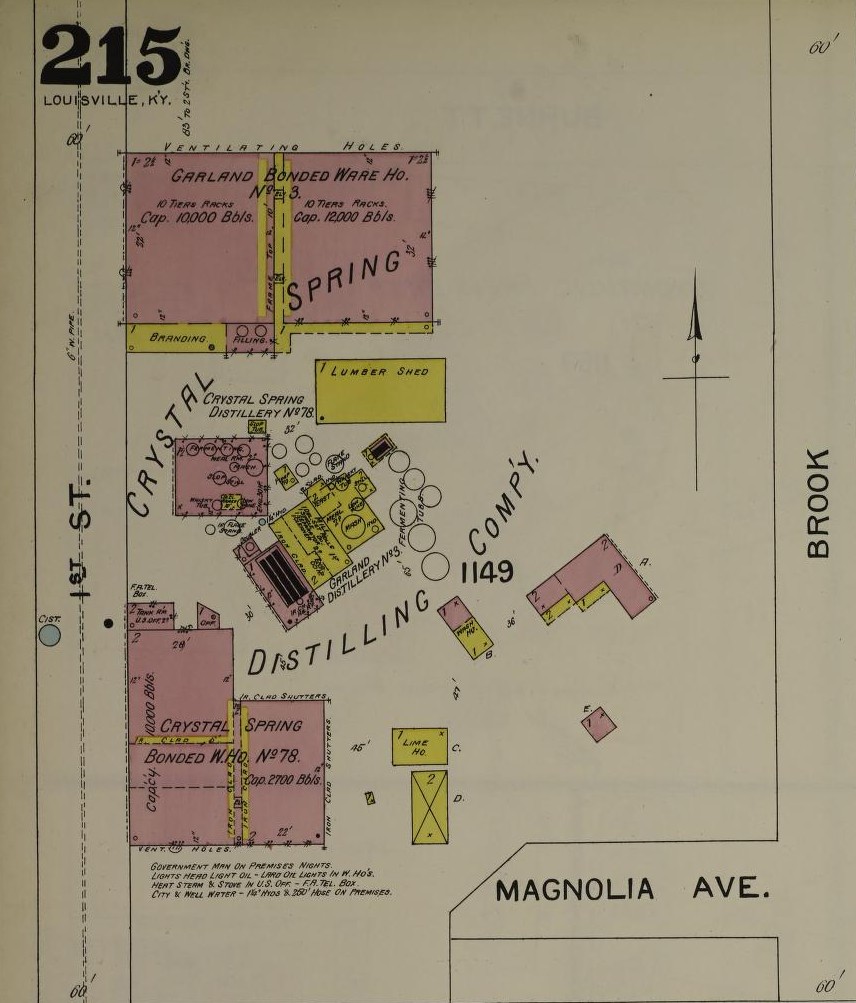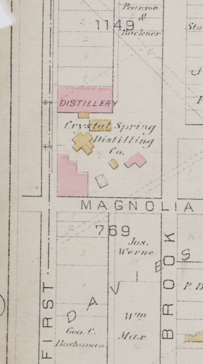 While the earliest of the Stitzel distilleries were being built, Frederick Stitzel, the eldest of Dominick’s sons, was working as a distiller for the Charles M. Laval Distillery, aka the Crystal Springs Distillery. The old Crystal Springs Distillery was located at 1st and Magnolia Streets in old Louisville. (See maps below- Today, that’s a residential neighborhood.) Jacob Laval, founder of the Laval Distillery, passed away in 1872, leaving the company to his son, Charles M. Laval. By 1874, Frederick was married to Emma Laval,  sister to Charles. The Laval/Crystal Springs Distillery had been absorbed by one of the largest dealers of whiskey in the country at the time- the Newcomb-Buchanan Company. H. Victor Newcomb retired in 1871 to become director of the Louisville & Nashville Railroad, leaving the Buchanan brothers to head the company. George C. and Andrew Buchanan got busy building an empire in distilleries, whiskey, cattle, and real estate in Louisville during the 1870s. Frederick Stitzel essentially became an employee of the Buchanans, even as he worked with his brother-in-law, Charles Laval, at Crystal Springs.