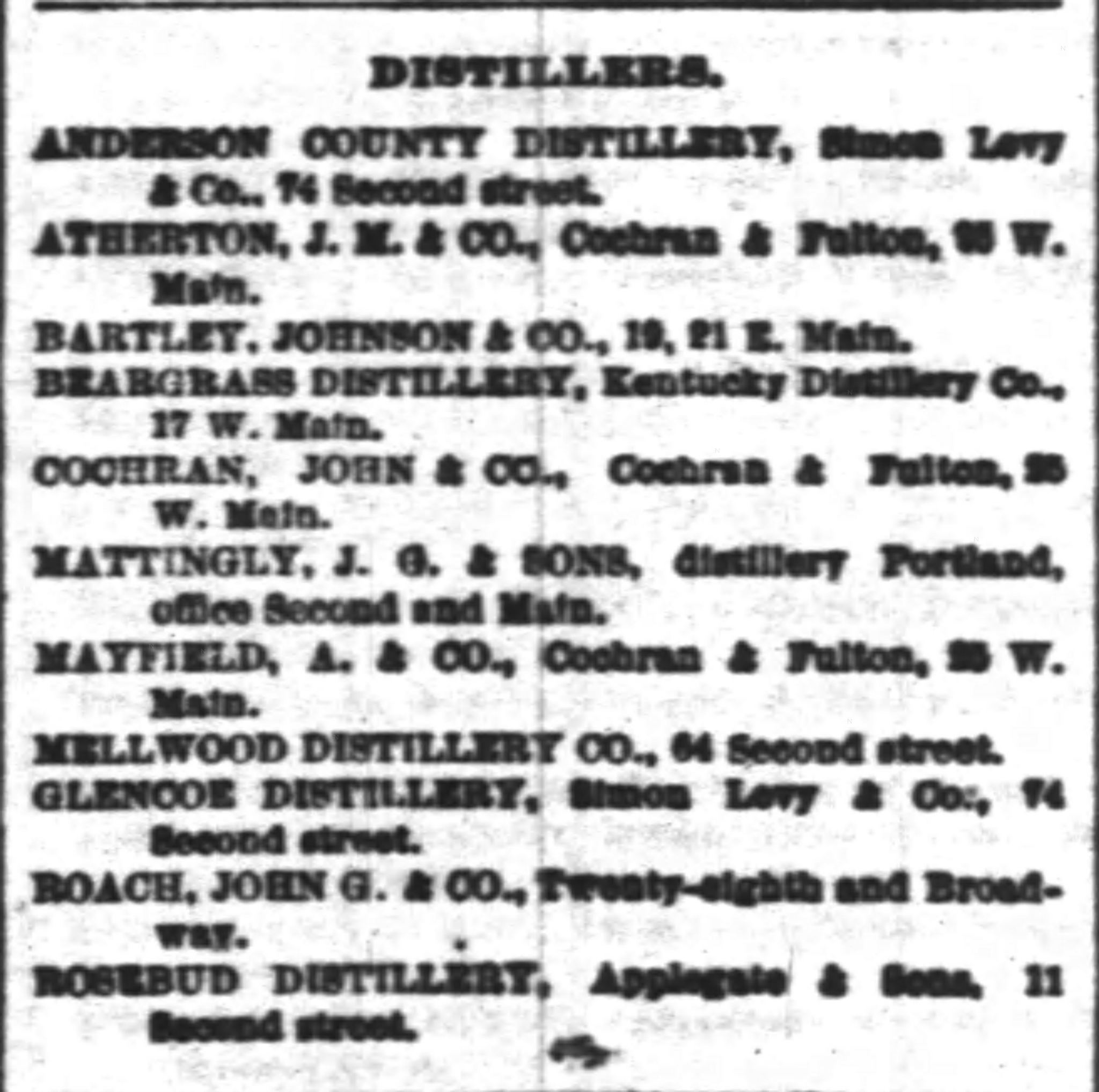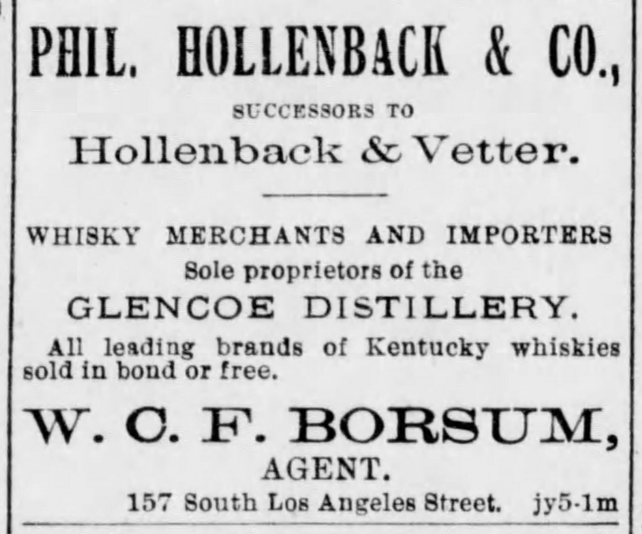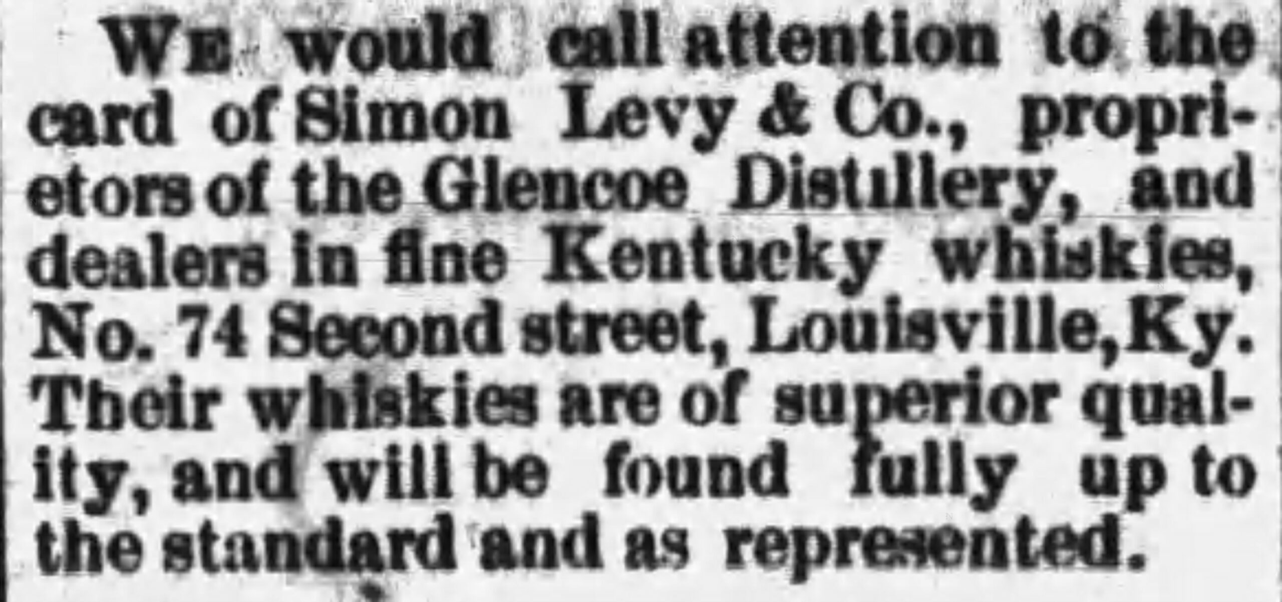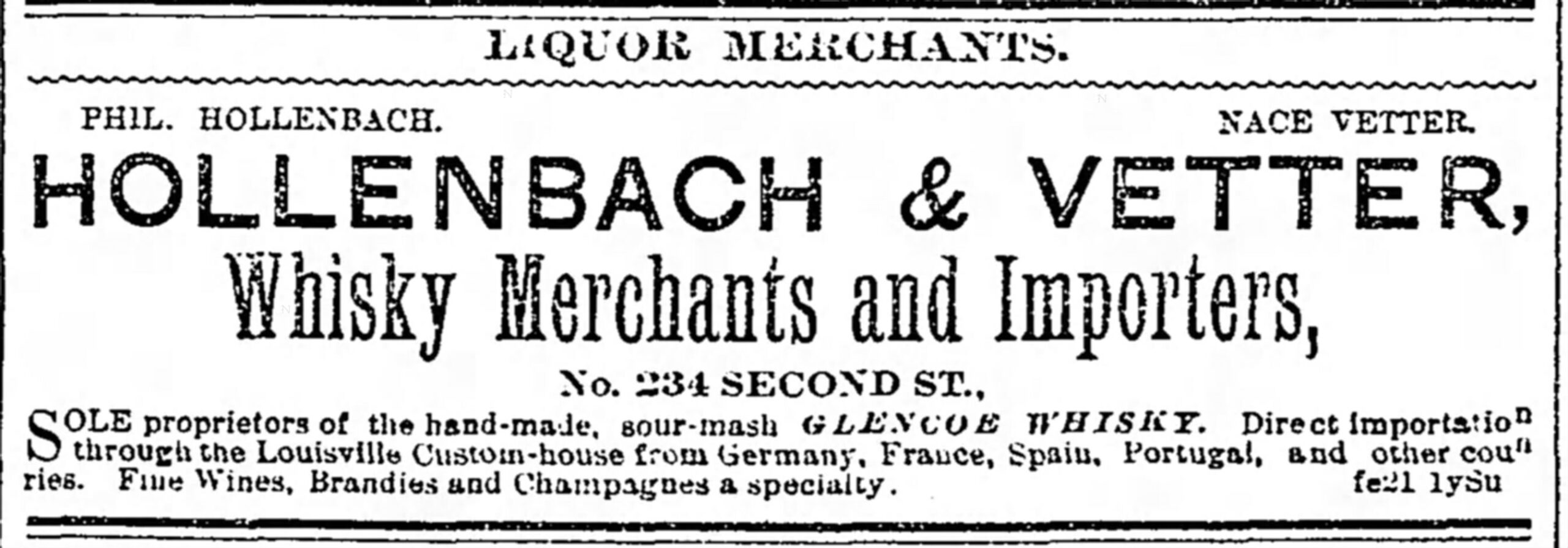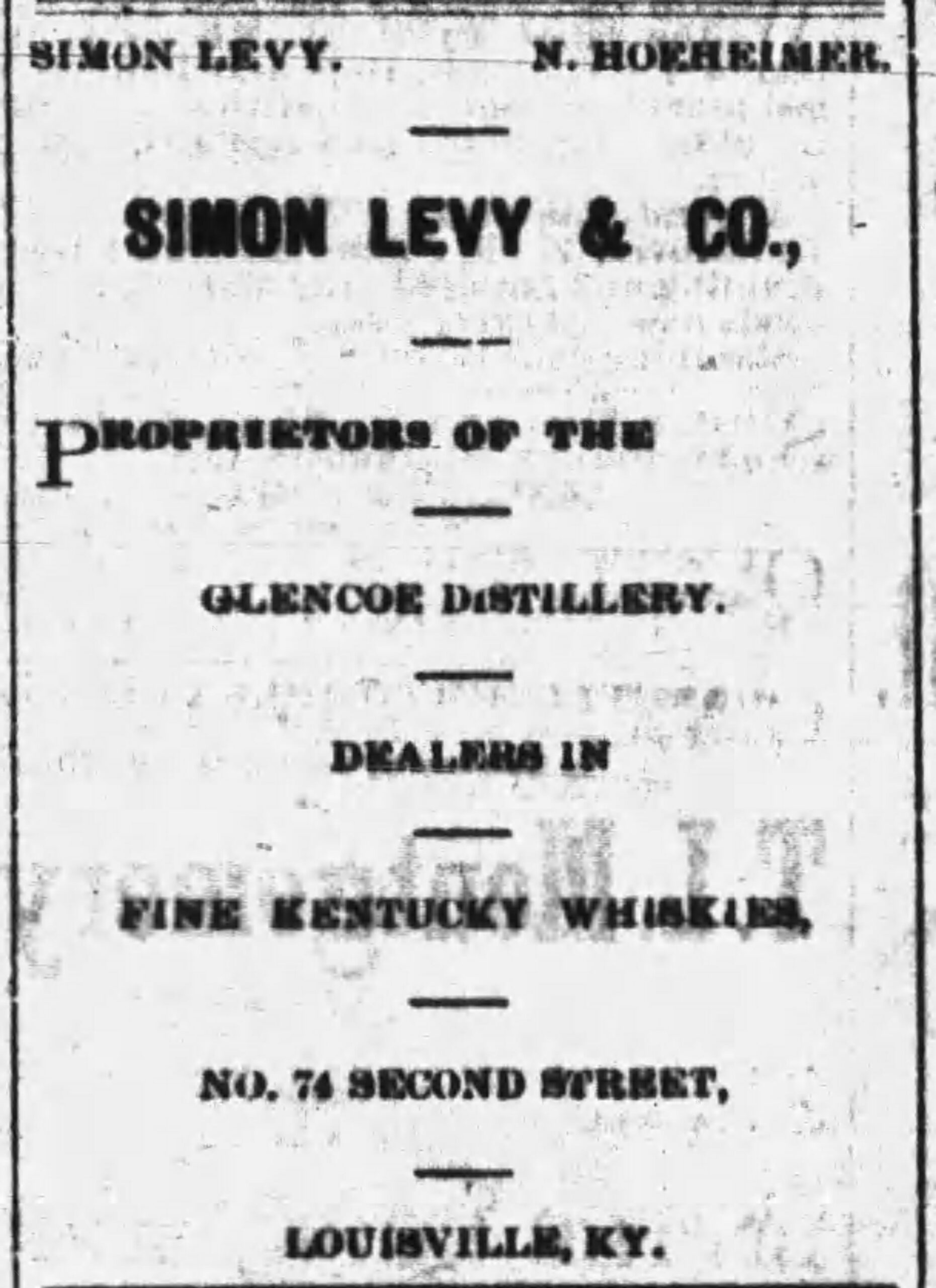 To put it simply, the Glencoe Distillery was the Stitzel Distillery at 26th and Broadway in Louisville. It’s hard to say with certainty where the name “Glencoe” came from, but the first liquor firm to use the name was Simon Levy & Co. of Louisville. Simon Levy’s partners were Nathan and Ernest Hofheimer of New York. The men managed a stand at 232 2nd Street and a retail store at 74 2nd Street in Louisville, but they also maintained satellite locations in other cities (Little Rock, Los Angeles, etc.), as well. In 1883, it appears that Simon Levy & Co. (or at least their rights to proprietorship of the Glencoe Distillery) was bought out by Phil Hollenbach & Co.’s retail establishment at 1st and Market Sts. in Louisville. Both Levy and Hollenbach’s brands were distilled by “the Glencoe Distillery.” While it is possible that both Levy and Hollenbach were referring to a rectifying establishment within their own wholesale locations, it’s more likely that they were referring to whiskey they purchased from the the Stitzel Bros. Distillery at 26th and Broadway. Early 1880s advertisements refer to both Simon Levy and Phil Hollenbach as “sole proprietors of the Glencoe Distillery”. (As I explained in Monday’s post, liquor firms were selling whiskey, not making it. The distillers of ‘Glencoe whisky’ were members of the Stitzel family even if the Glencoe brand was being marketed for sale by Levy or Hollenbach.)