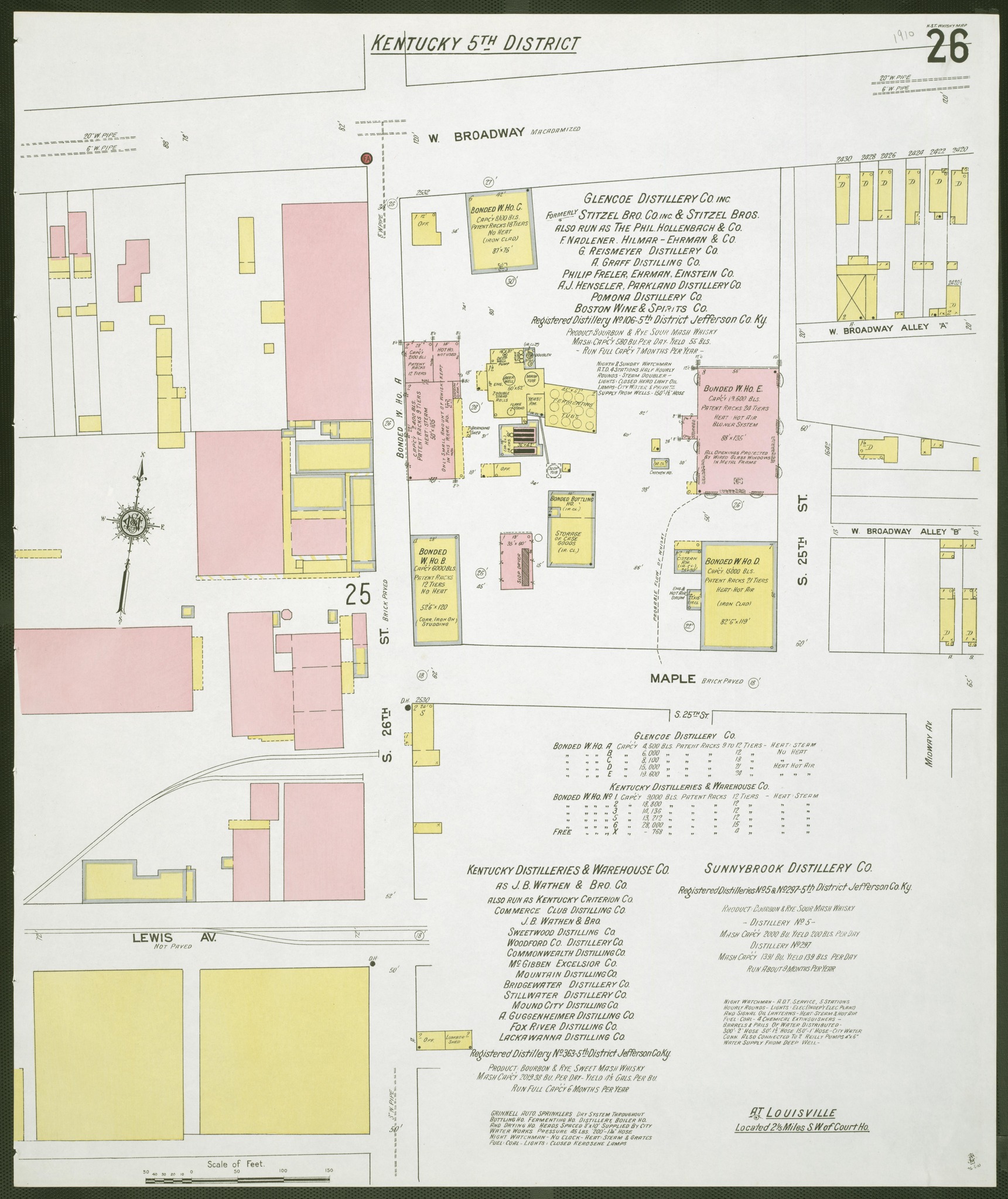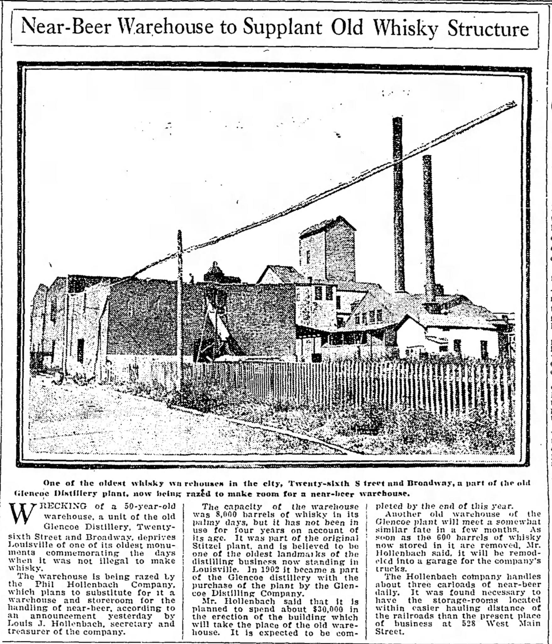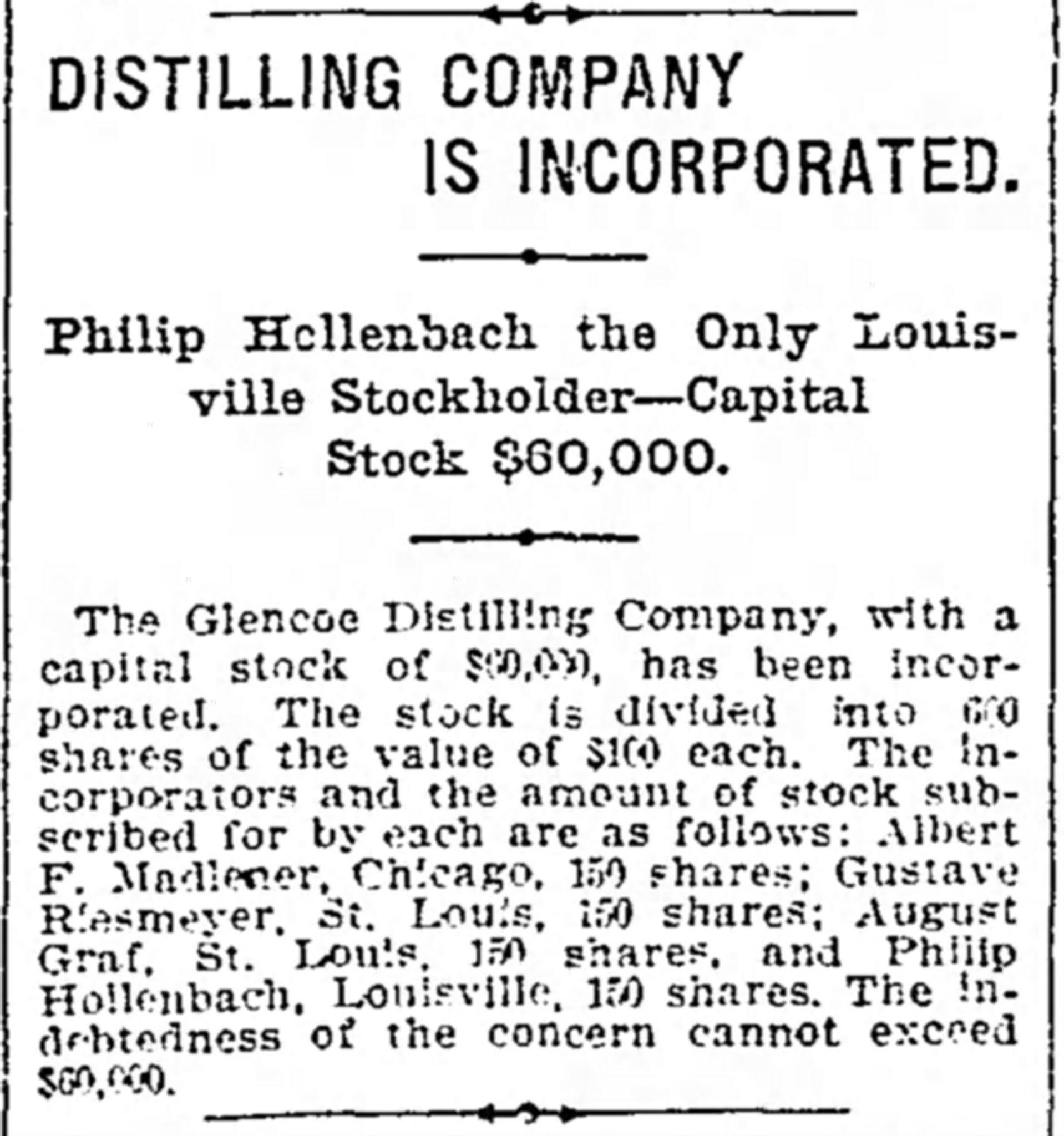 3. In June 1902, The Glencoe Distillery Company was incorporated in Jefferson County by four whiskey men- Albert F. Madelener of Chicago, Gustav Reismeyer and Gustave Graf, both of St. Louis, and Phil Hollenbach of Louisville. This incorporation effectively allowed Phil Hollenbach to retain his ownership of the brand he built. He continued to manage production at the Glencoe Distillery on 26th and Broadway, ownership of the plant had been passed to the Kentucky Distilleries and Warehouse Company.