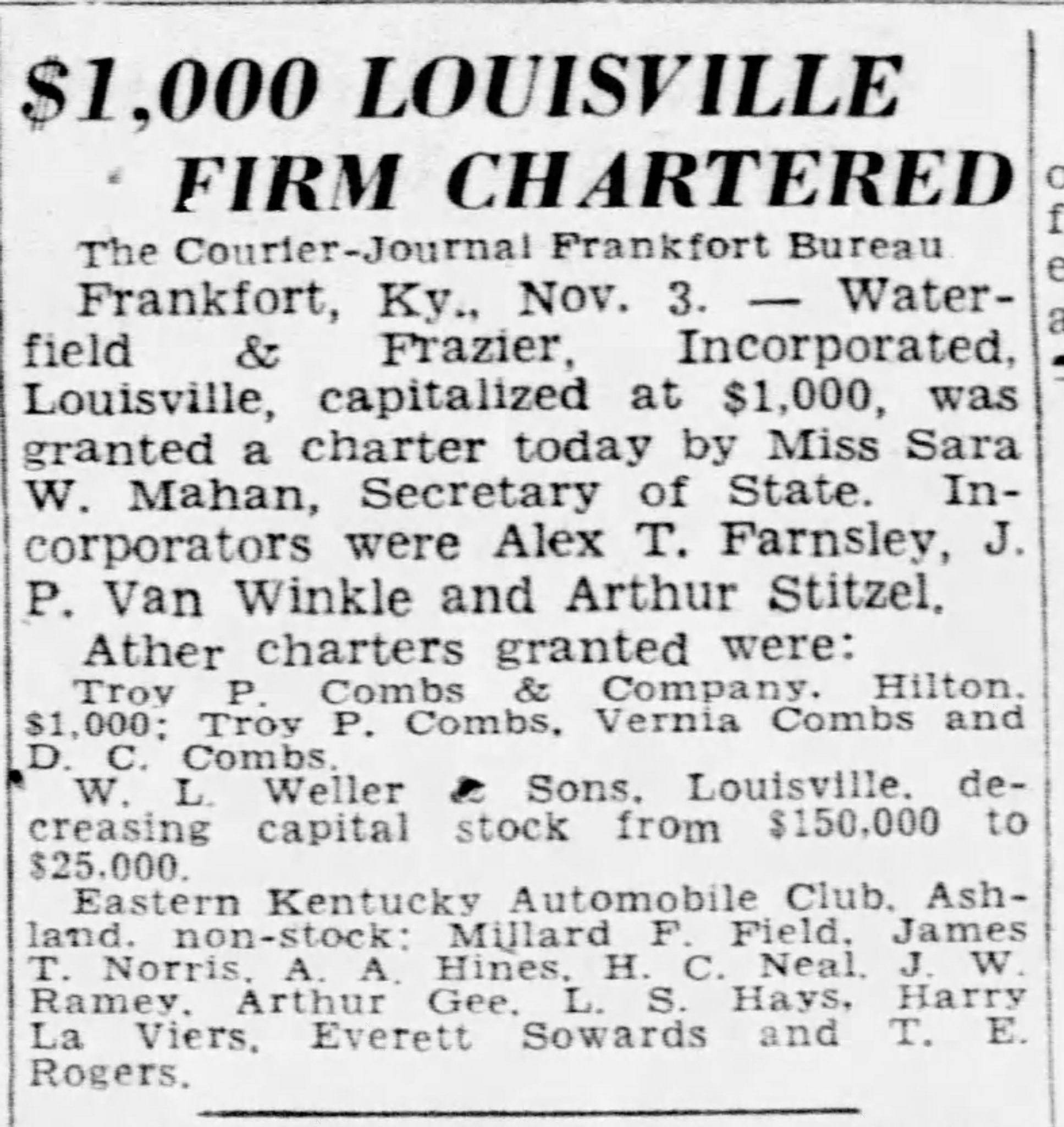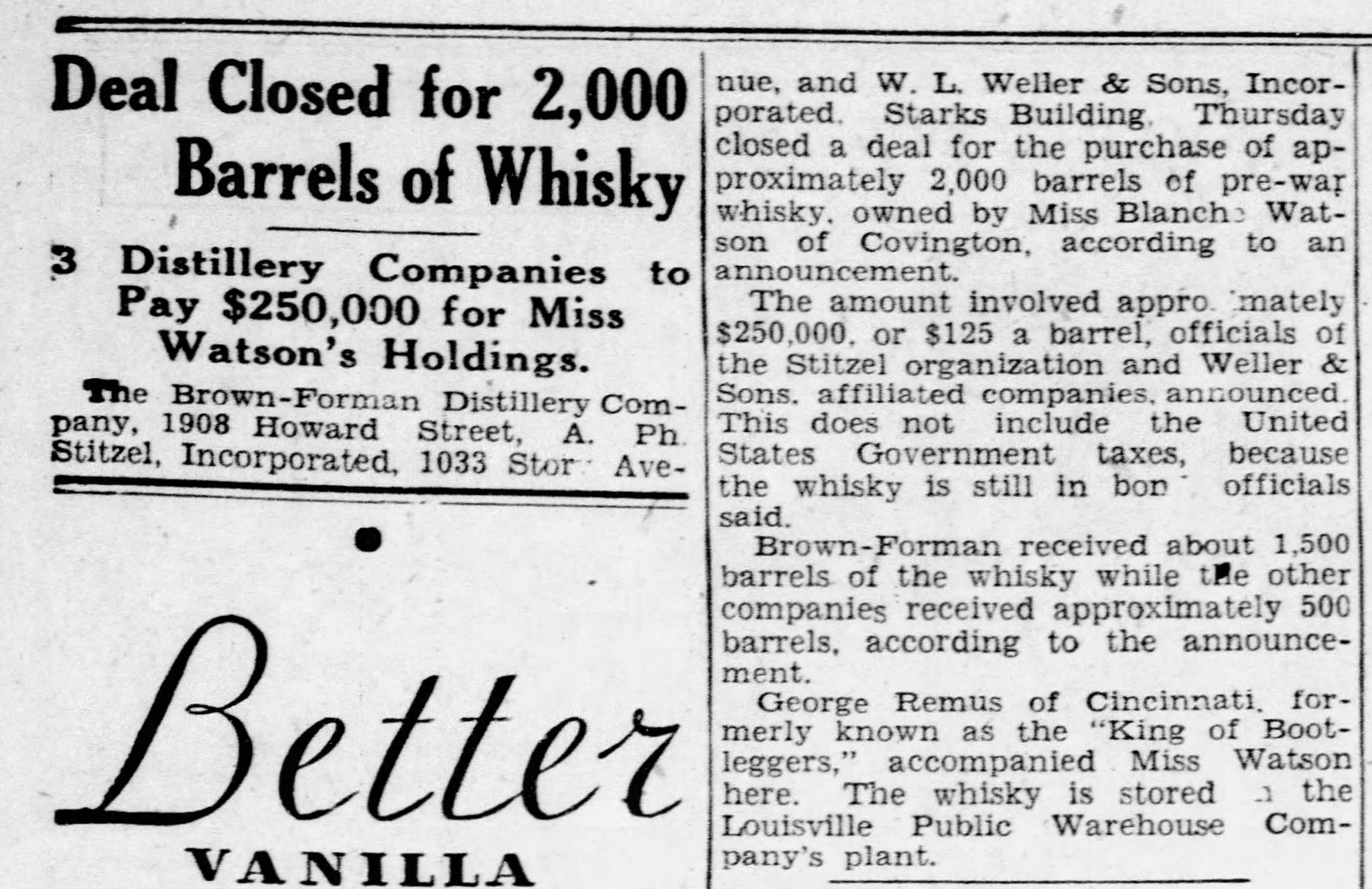In February 1930, more crossover between Louisville’s distillery companies was made evident. Miss Blanche Watson, former secretary of George Remus, sold about 2,000 barrels of whiskey that had belonged to her employer to two companies- The Brown Forman Company and the A. Ph. Stitzel Company. ¾ of the whiskey was sold to Brown Forman (approx. 1500 barrels) and ¼ was sold to Stitzel (approx. 500 barrels). The fact that George Remus had been present for the sale of those barrels in Louisville after being released from prison for bootlegging in 1924, killing his wife in 1927, and being acquitted for that crime before selling those barrels for about $210,000 is…well, a bit of a hard pill to swallow. Add to that the fact that Miss Watson then took some of that money from that sale of barrels to a horse track in New Orleans, bet on one of her own horses at 5 to 2 odds, and win…well, let’s just chalk it up to Prohibition being a good time to play fast and loose with money and morals.