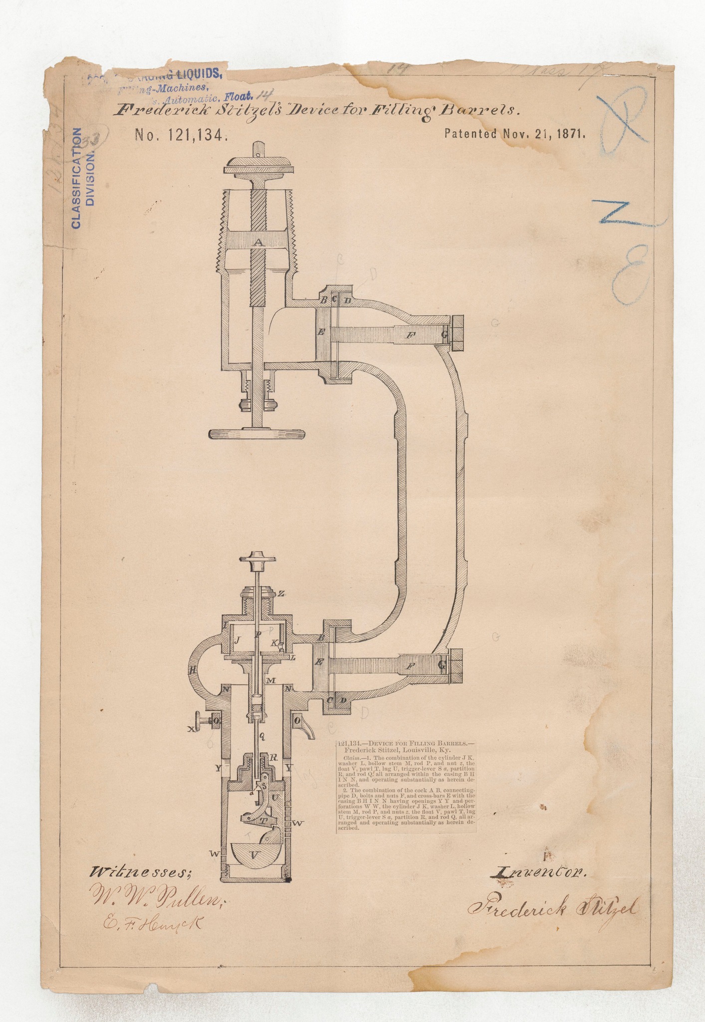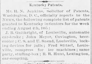 Frederick’s inventive business mind was not fazed by the accident. In fact, he seemed to become more committed to his inventions after the accident. While he recovered from his burns, he likely had plenty of time to think. No stranger to practical engineering, Frederick had been working with other inventors and applying for patents for his inventions for many years. While Fred Stitzel may be most often recognized by whiskey historians for his “rack for tiering barrels” patent in 1879, he had been an inventor throughout his life. 8 years before his barrel rack invention, he designed a method to improve the filling of barrels. He also invented his own patented process for speeding the maturation of whiskey.