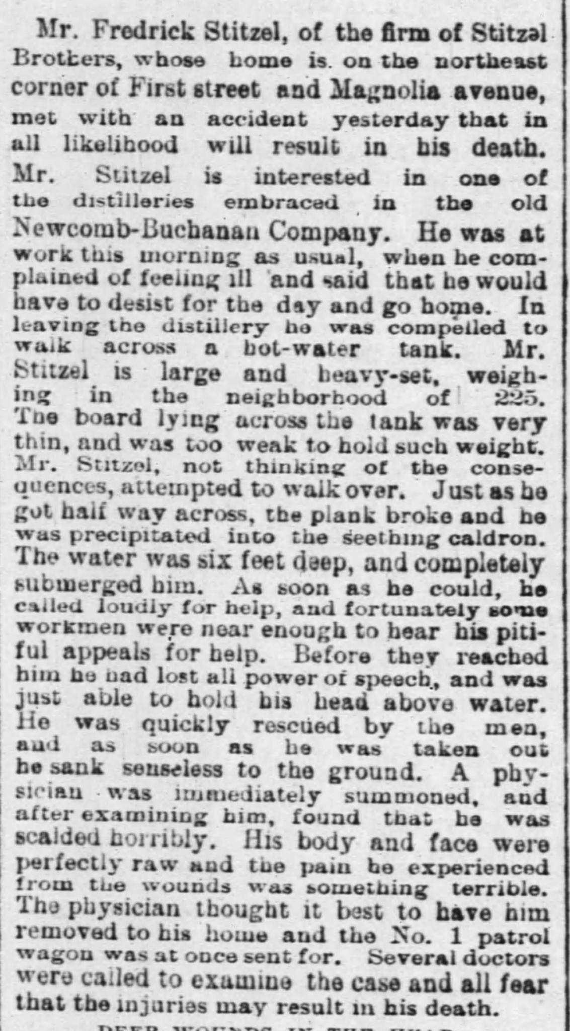 On May 18, 1885, Frederick, 42 years old and approximately 225 lbs., walked across a wooden beam stretched over a boiling tank of water. He’d probably done it a thousand times before, but that board collapsed under his weight that afternoon, dropping him into a 6-foot-deep boiling vat. He was pulled from the vat after his fellow workers heard his screams, but by the time he was pulled free, most of his body was scalded raw and his hair had nearly all come off. Doctors removed him to his home, which was thankfully beside the distillery on the same city block. Every visiting doctor warned that Frederick would not recover from his injuries, but he would prove them all wrong. He shared his home at 1st and Magnolia Sts. with nine women- including his wife, daughters, mother-in-law, and sisters-in-law. Suffice it to say, he was well looked after. Frederick would go on to live for almost another 40 years.