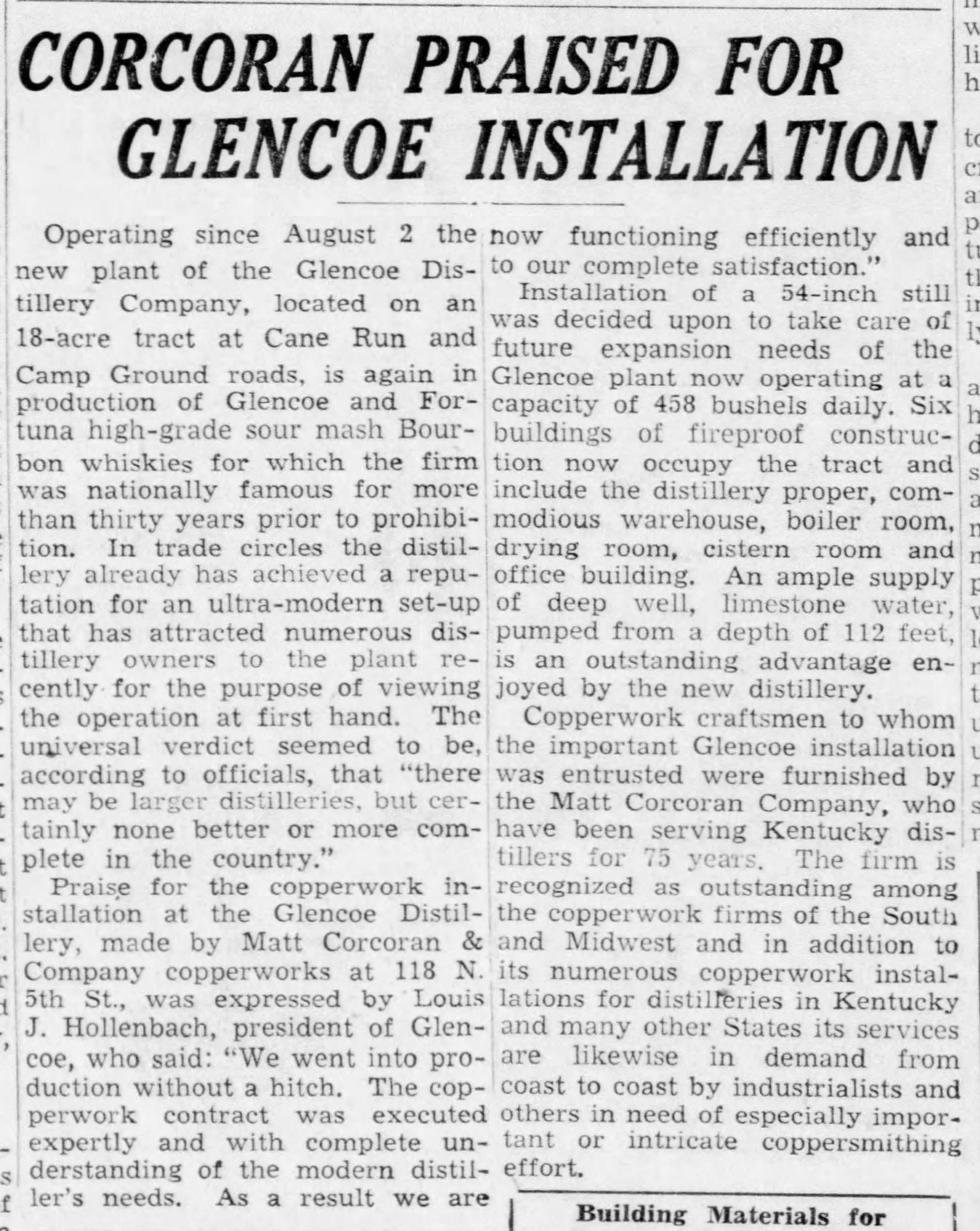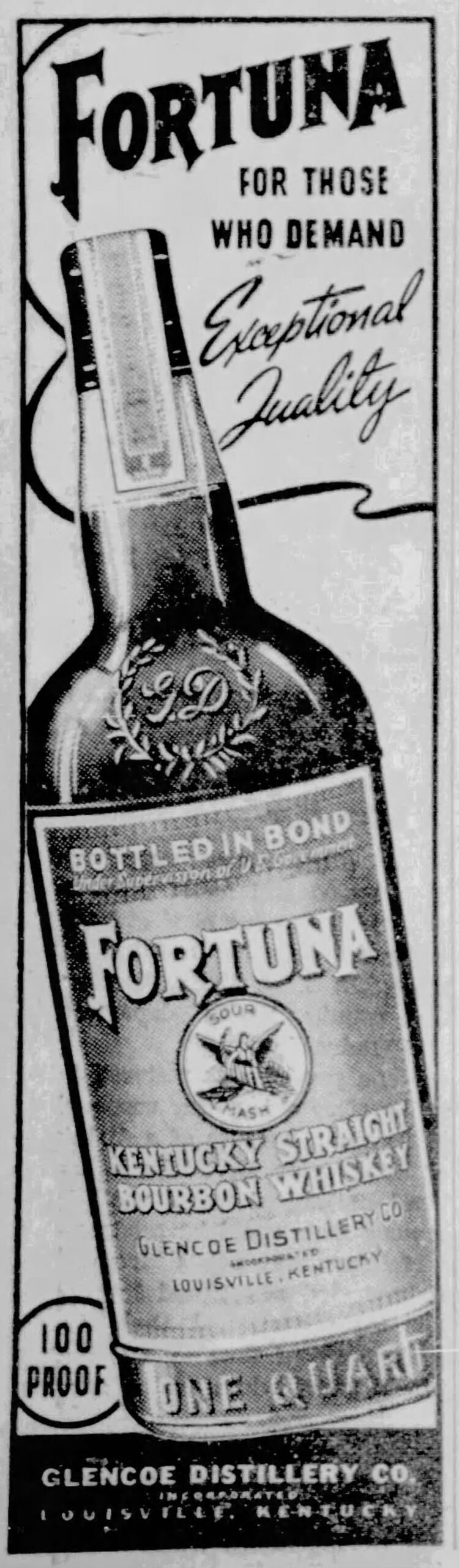 The Glencoe Distillery continued to operate under the ownership of the American Spirits Manufacturing Company until it was closed by Prohibition. The distillery buildings were demolished in July 1924, but the brand would live on…without any connection to the distillery that made it famous. A new Glencoe Distillery would surface again in the 1930s- Louis Hollenbach built a new distillery at the corner of Cane Run and Campground Rds. The Hollenbachs would manufacture Glencoe and Fortuna whiskeys once again. It had been his brand since the 1880s, and Hollenbach would sell his new iteration of his old brand to a new generation of drinkers. The distillery was sold in 1943 to National Distillers and McKesson & Robbins. (Remember them?)