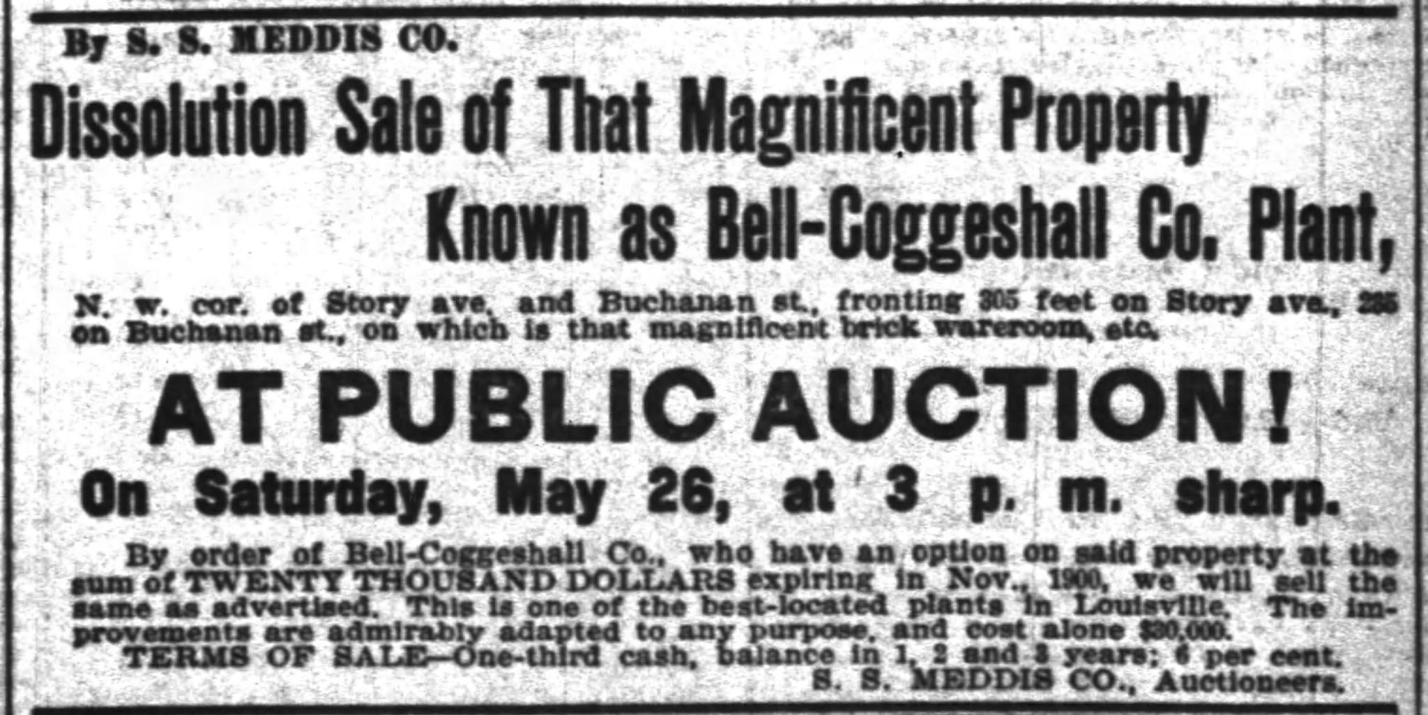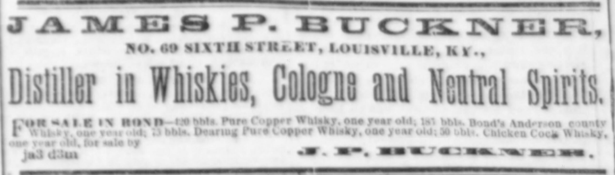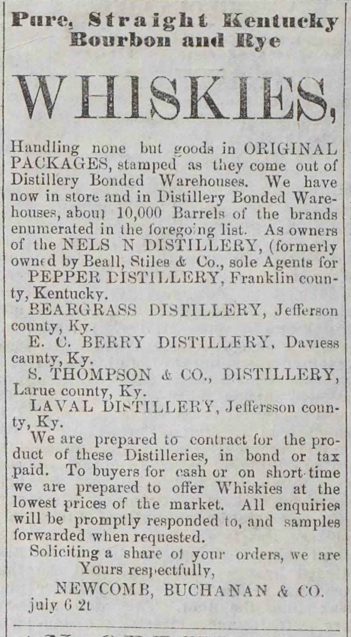 Louisville had been host to the Industrial Exposition from 1872 to 1873, so the future looked very bright for the Buchanans. Unfortunately, a financial panic in 1873 and stiff competition from Cincinnati and St. Louis put stress on even the largest liquor companies. Newcomb-Buchanan Co. was incorporated in 1875 and widely advertised over the next several years, but they overextended themselves. The company failed in 1878 and went into receivership.