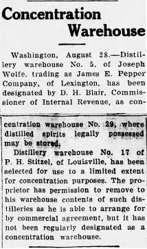 Perhaps now is a good time to remind folks that concentration warehouses are a large source of confusion when it comes to the source of pre-Prohibition brands. The lines between who manufactured whiskeys before Prohibition and who sold most of that whiskey during Prohibition began to blur as early as the 1920s. Newspaper articles often list a concentration warehouse site as being responsible for manufacturing brands when all they were doing was bottling the whiskey that had been stored in their US bonded warehouse. Thankfully, the Bottled-in-Bond Act of 1897 made it necessary to include the name of the original manufacturer on the bottle. In most cases, that information is either revealed on the tax stamp or on the back label- NOT on the front label.