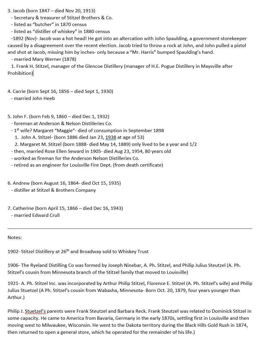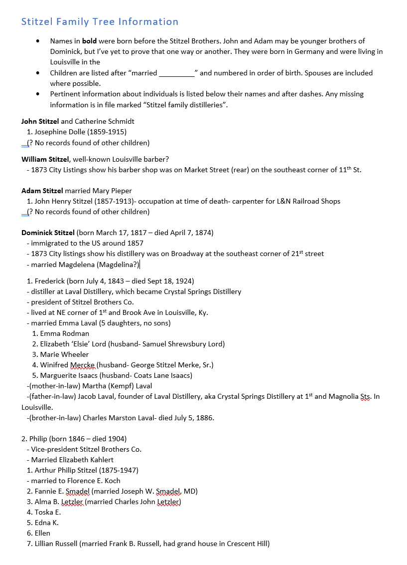 The way I see it, people are what make American whiskey history interesting. Real people made real whiskey and built real legacies for their families- legacies that remain with us to this day! Reducing these real people into marketing blurbs or props to sell brands feels false somehow. I enjoy the opportunity to set the record straight- or at least as straight as I can get it! I find American whiskey distillers endlessly interesting! Even if history’s distillers are no longer with us, their stories provide touchstones for modern whiskey distillers and lend authenticity to old whiskey brands for consumers (even if the new brand versions are completely unrelated). The histories of distillers like the Stitzels help to reveal the complexities of the industry and provide context for the larger picture of what the industry was like during their lifetimes.