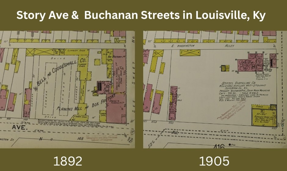 3. Frederick Stitzel remained a part of the Anderson & Nelson Distilleries Co. through his partnership with the Laval family and, later, with Fred W. Adams. The new Stitzel plant was built just across the Beargrass Creek from that grouping of distilleries (Nelson, Anderson, Buchanan distilleries & warehouses- and the Fink, Allen and Bradley warehouses). The decision to build at Story and Buchanan streets may have been due to its convenient location near the other plants Frederick was invested in.