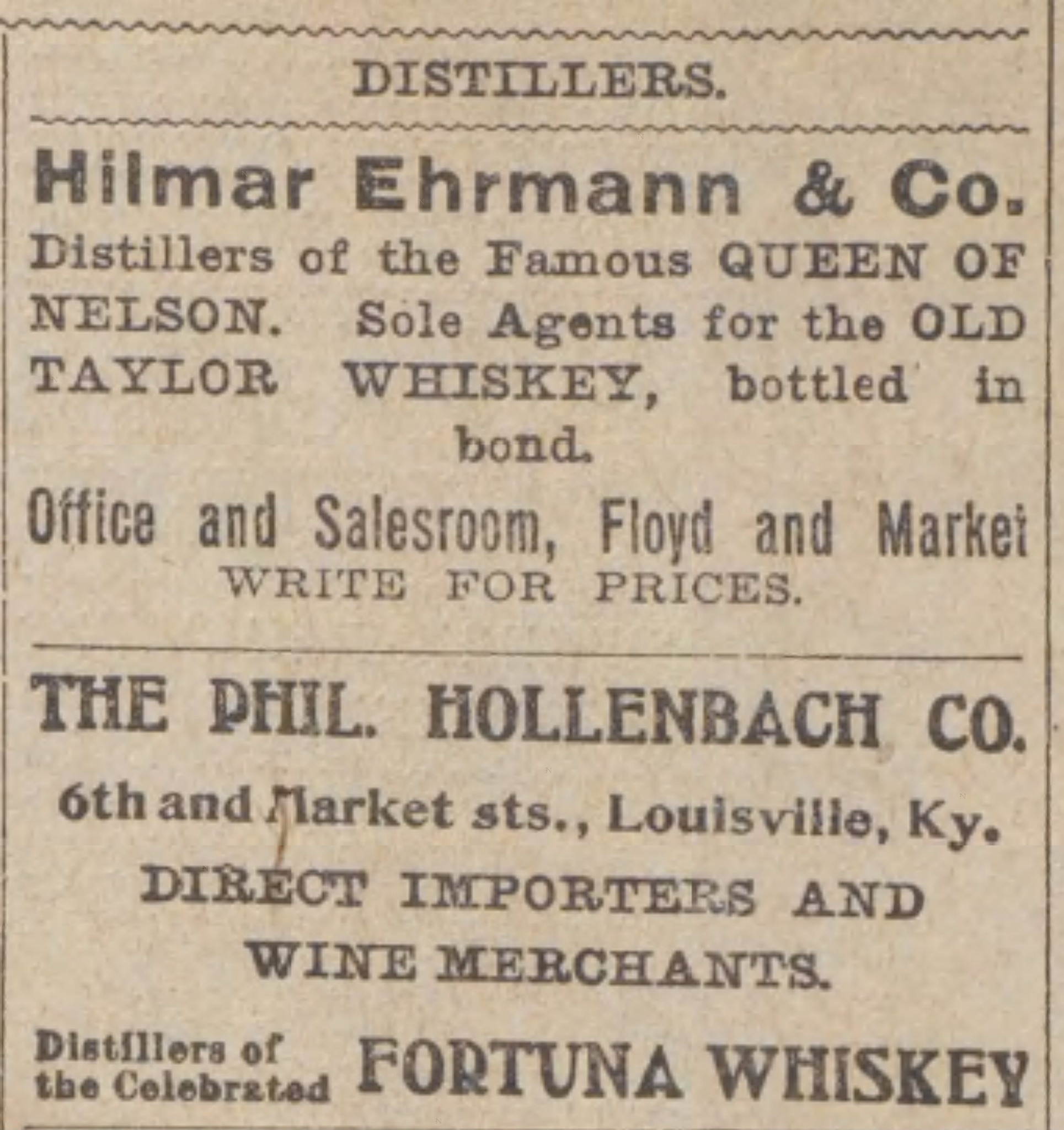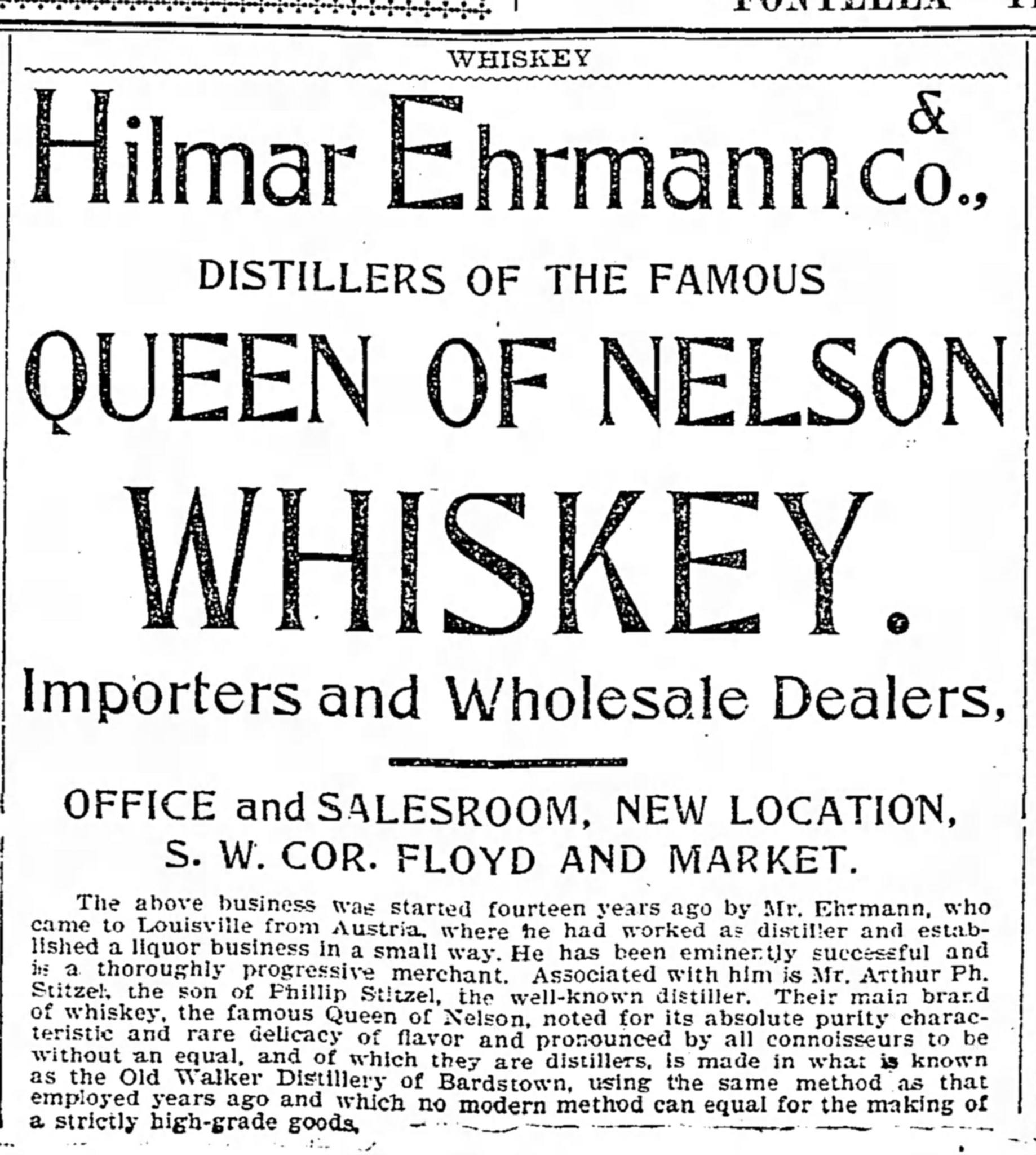 2. Philip Stitzel retired from active business. Arthur Philip Stitzel, 27-year-old son of Philip Stitzel, withdrew from the firm of Hilmar Ehrmann & Co., famous for their “Queen of Nelson” brand of sour mash whiskey. Arthur was drawn into a lawsuit for his departure, after serving less than 2 years of what was supposed to be a ten year partnership. Hilmar & Ehrmann bought most of their whiskey from Thomas B. Ripy’s distilleries in Bardstown. These neighboring distilleries were the T.B. Ripy/Old Walker Distillery, RD #112 and the Clover Bottom Distillery, aka Waterfill Dowling & Co. RD #418. Both distilleries were connected to the Anderson & Nelson Distilleries Co., so it makes sense that A.Ph. Stitzel found a place within the Hilmar Ehrmann Co., even if it was short lived. It appears he left the company to assume a place within the Stitzel Brothers Company after his father, Philip Stitzel, retired and the new distillery in Louisville was complete.