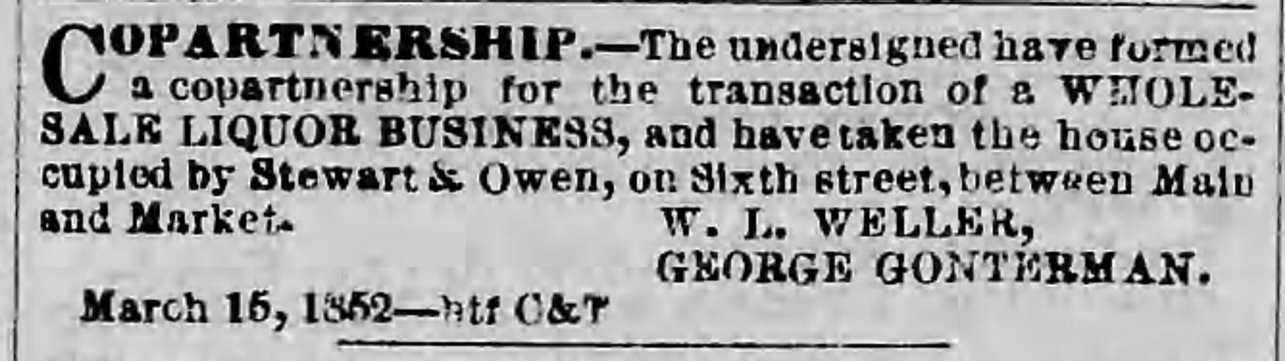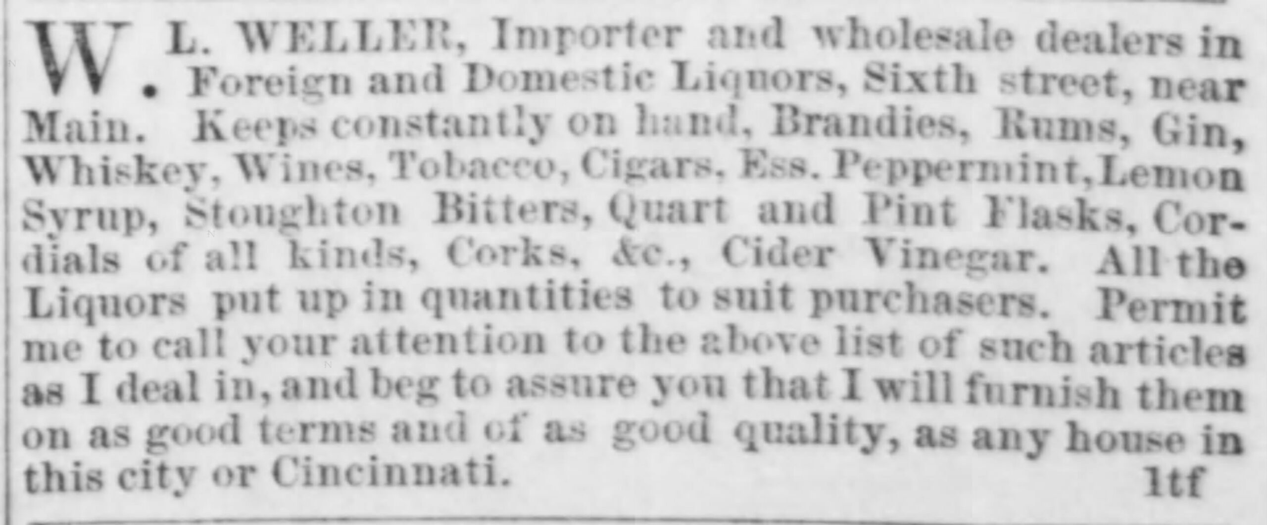 By the mid-1850s, the wholesale store on 6th Street between Main & Market (1st belonging to Stewart & Owen and then to Weller & Gonterman) was listed as simply “W.L. Weller”. William’s brother, Charles David Weller, joined the firm in 1860, which changed the firm’s name again to “W.L. Weller & Bro.” Unfortunately, Charles died on July 1, 1862 while serving as a soldier for the Confederacy. (An ad with his name as co-partner of “W.L. Weller & Bro.” was printed in the Louisville Daily Express less than two weeks before his death.)