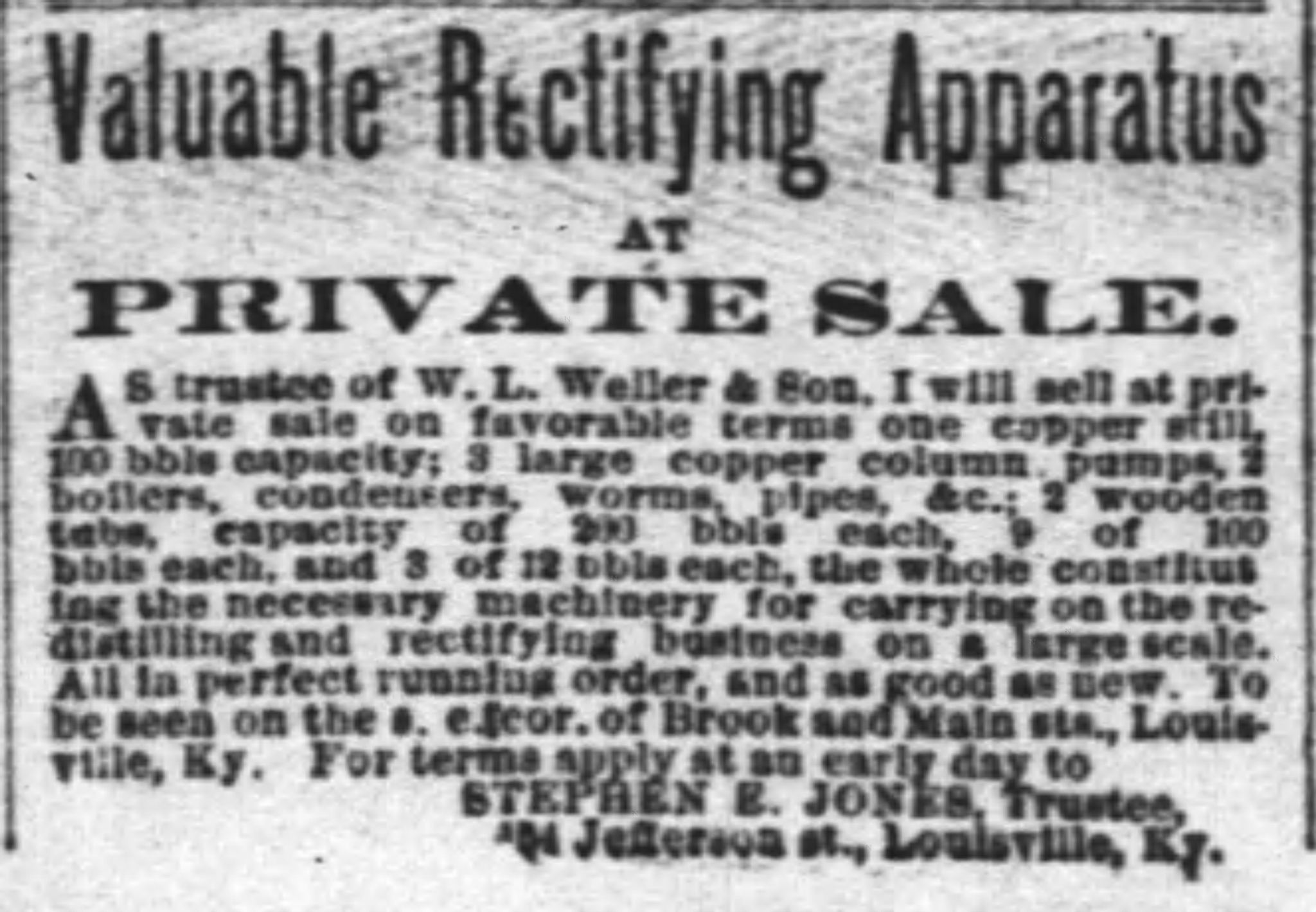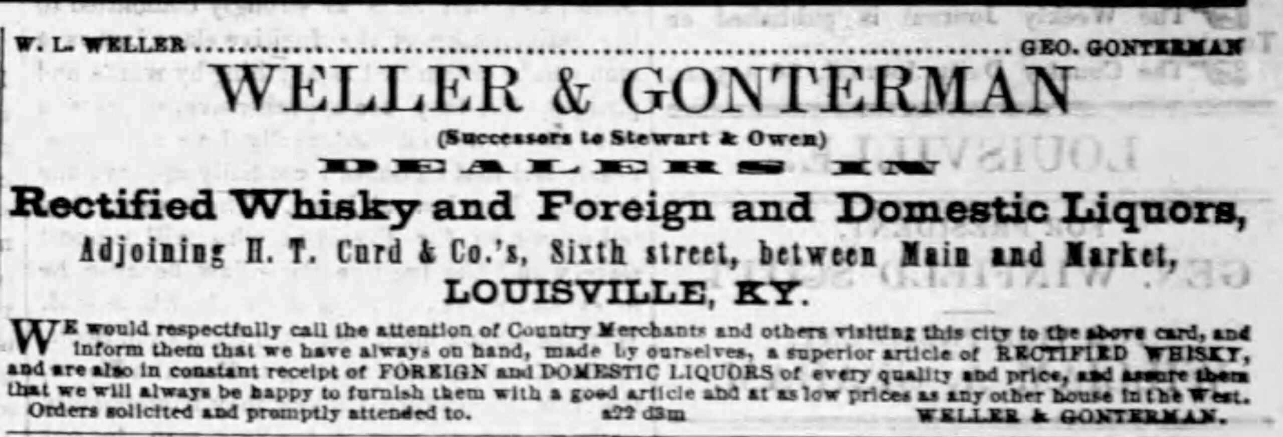 The Stitzel Distillery at 26th and Broadway was founded in 1872, while W.L. Weller & Son had been founded almost a quarter century earlier (1849) and represented one of the oldest liquor houses in Louisville. The location where William Lerue Weller built his business with his son, George P. Weller, as W.L. Weller & Son was located at Brook and Main Streets. (Today, that site is a small parking lot.)