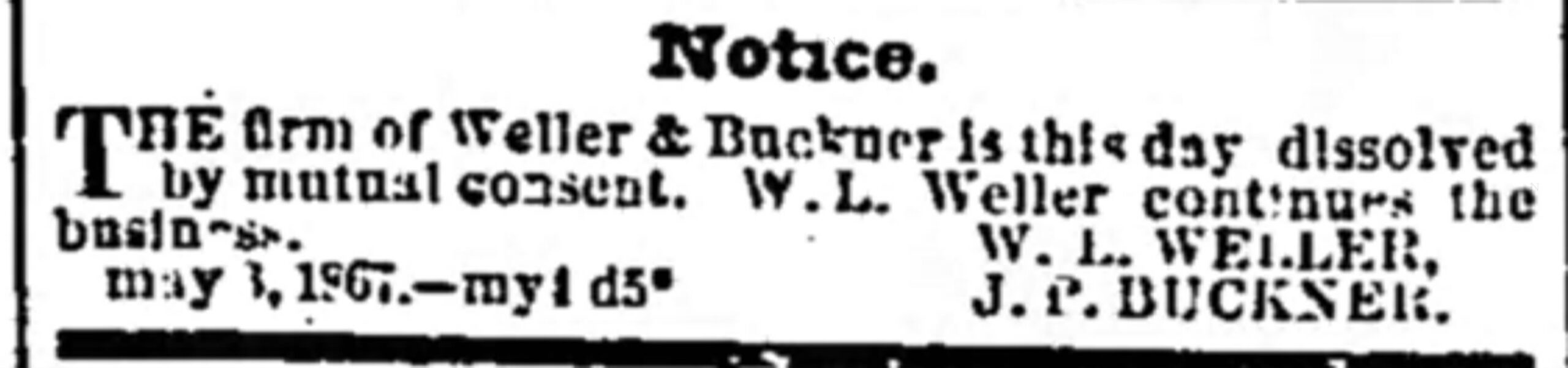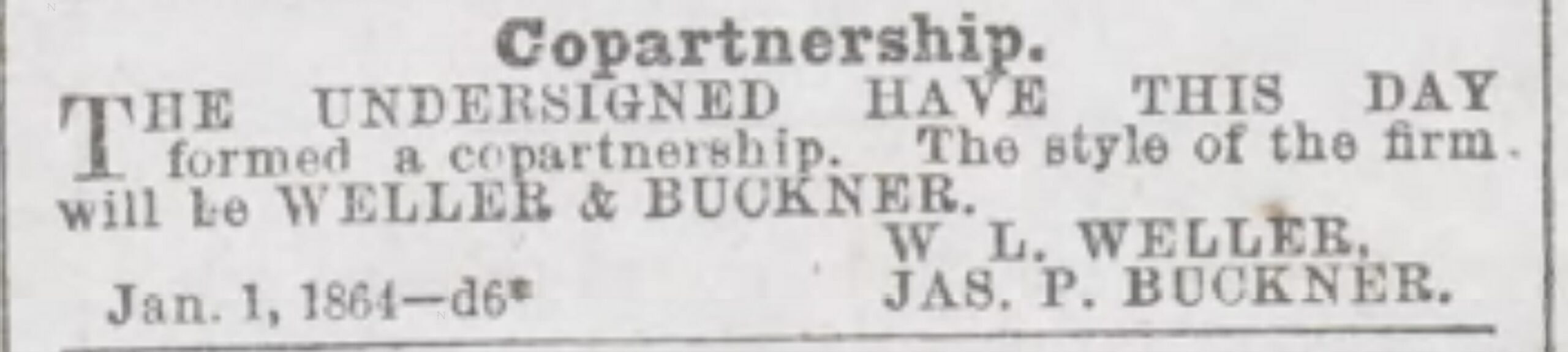 After the war, William partnered with James P. Buckner, though their association was short-lived. Their shop was in a new location- 612 Main Street, across the street from the Louisville Hotel. William and James parted ways in May 1867. James P. Buckner began to advertise himself at 69 Sixth Street, while W.L. Weller relocated again to 24-28 2nd Street.