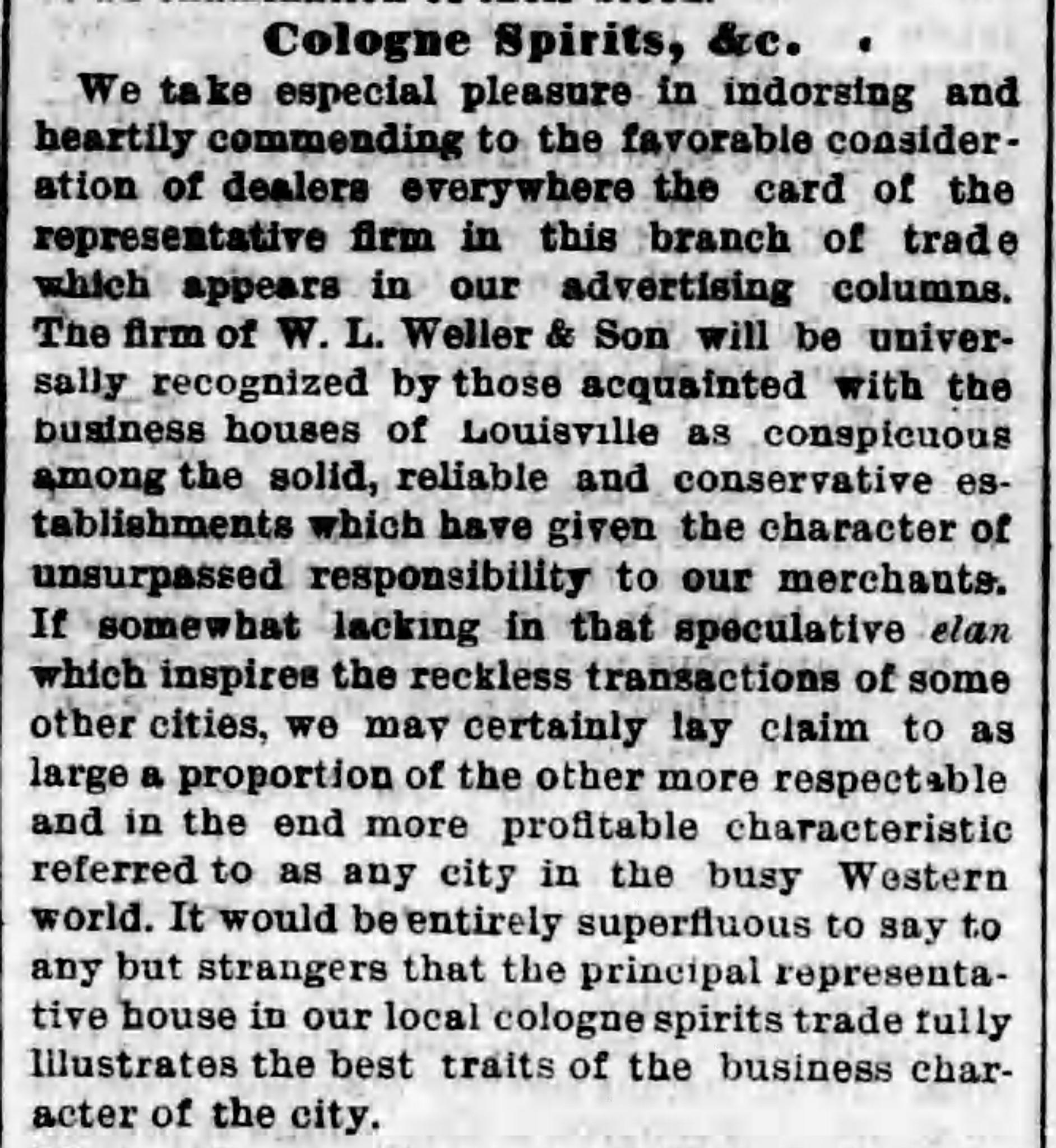 William Lerue Weller was born in Lerue County on July 26, 1825, son to Samuel and Phoebe (LaRue) Weller. (His grandfather founded LaRue County.) He came to Louisville when he was 19 years old, and enlisted in the Louisville Legion during the Mexican-American War (1846-1848). After returning from his deployment, he married Sarah B. Pence (1850) and became involved in the local liquor trade. In 1852, William partnered with George Gonterman. The two men were successors to Stewart & Owens, a successful wholesale firm in Louisville that handled everything from liquor to coffins.